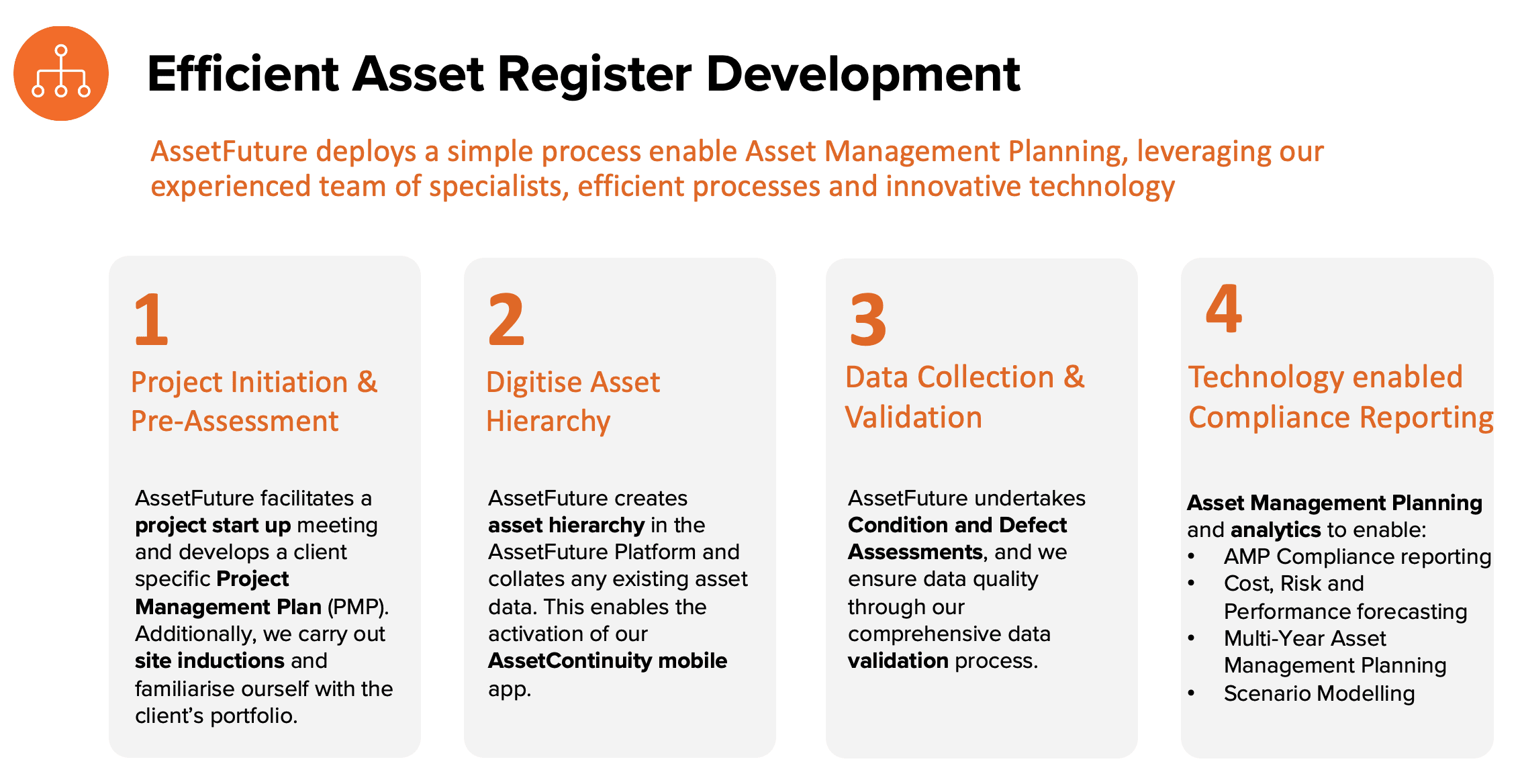 Scalable and repeatable processes: Technology-driven solutions ensure that asset data capture, reporting, and lifecycle forecasting are efficient, scalable, and meet compliance obligations.